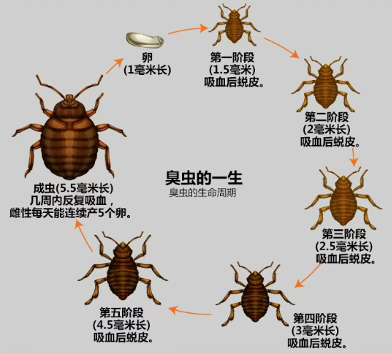 (四)耐饿性强:在没有食物来源的情况下,臭虫耐饿性极强,成虫通常可存活6~7个月甚至1年以上,若虫也能耐饿2个多月。